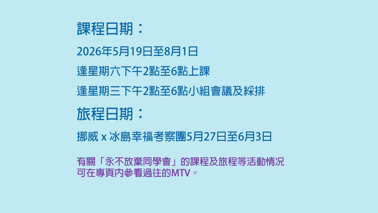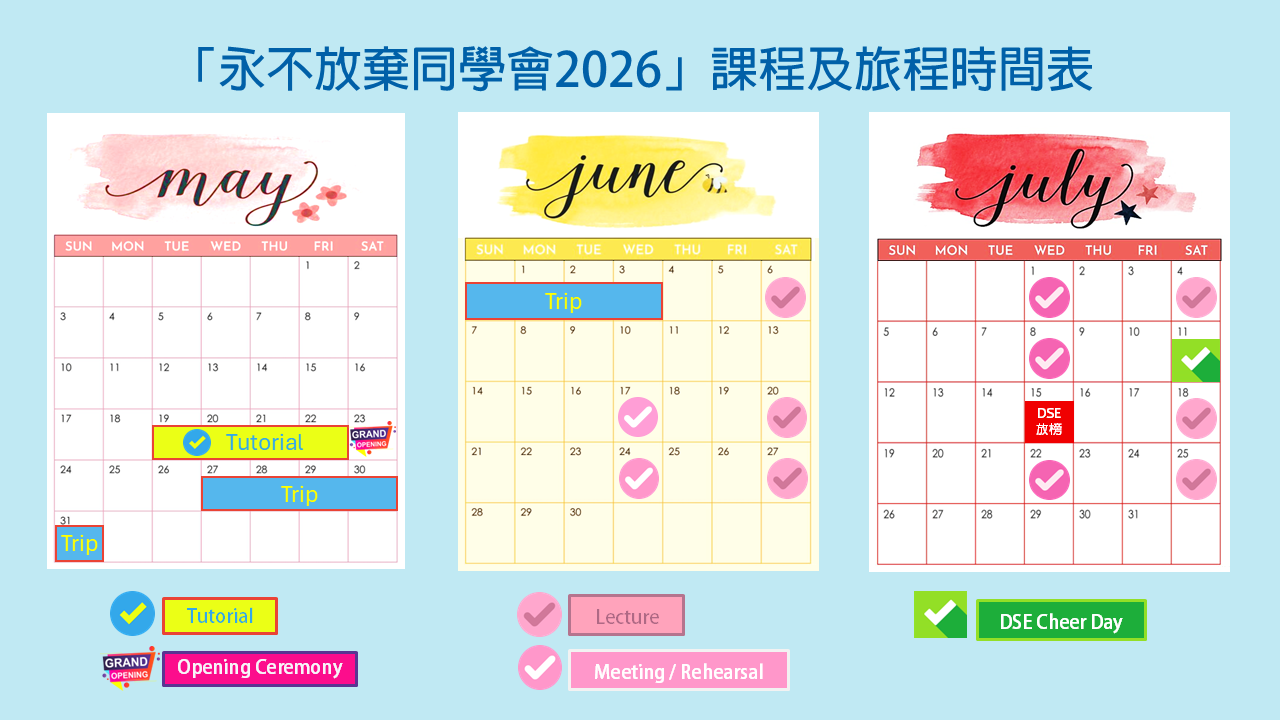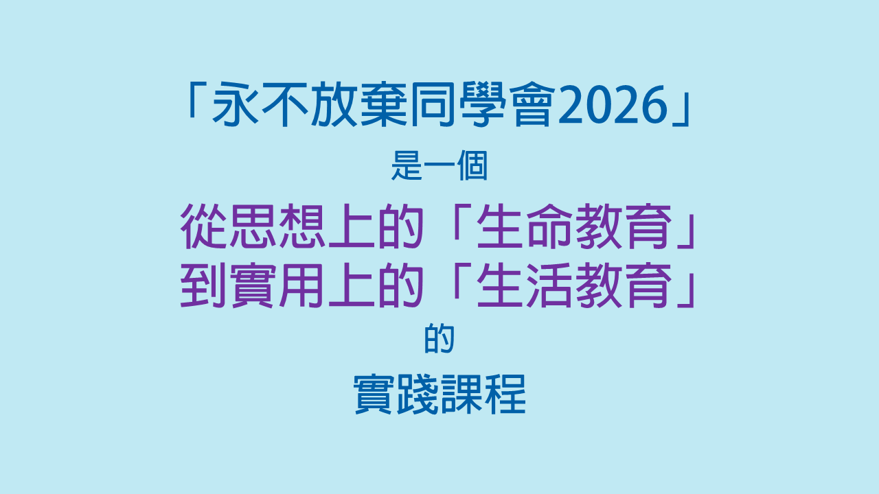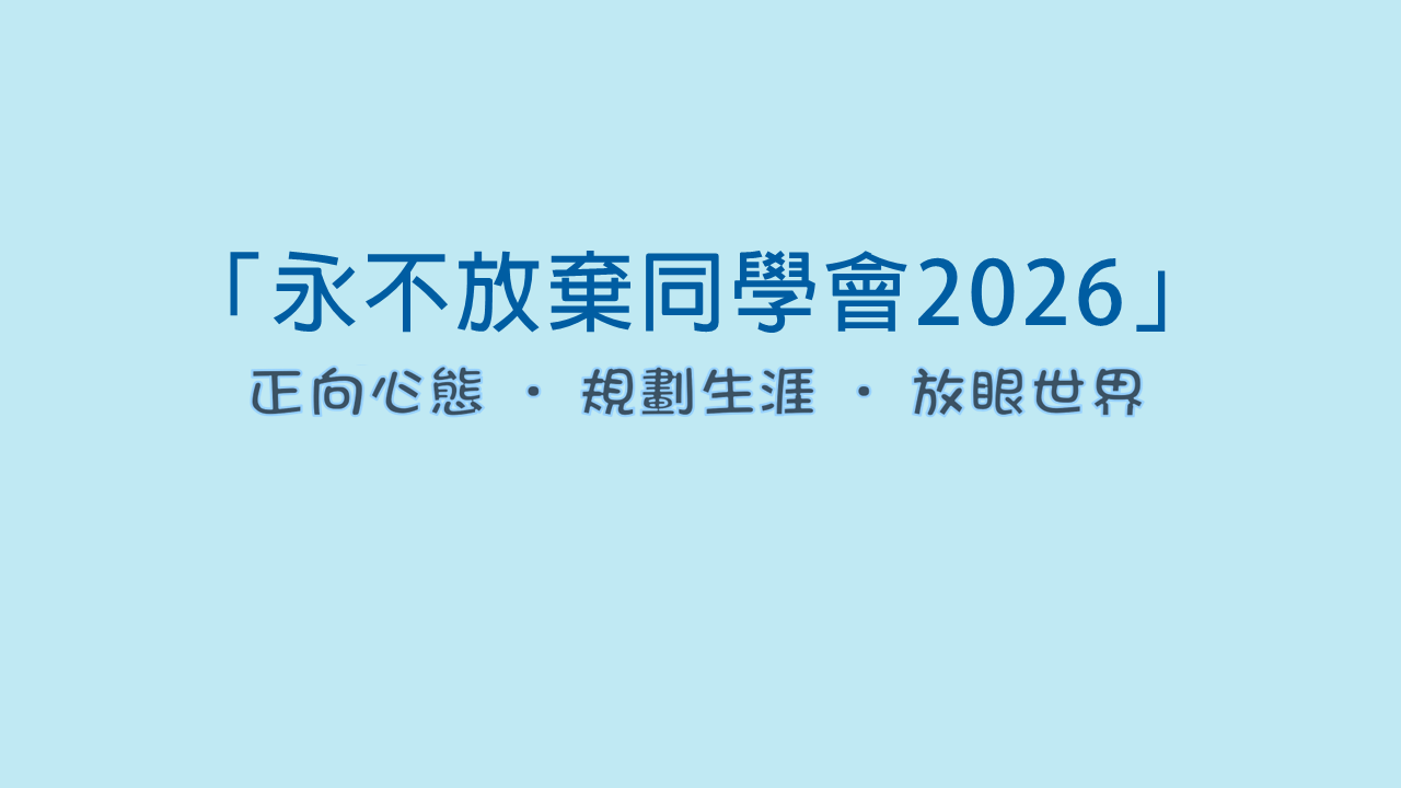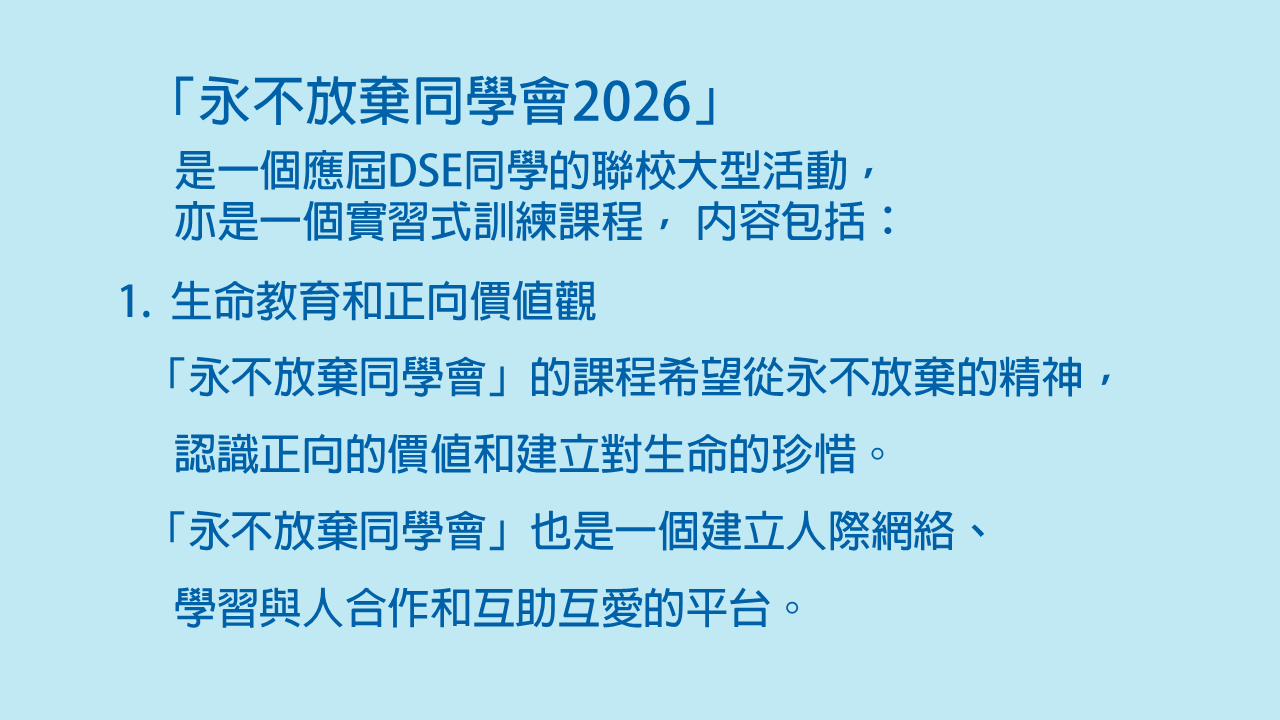 「永不放棄同學會」成立至今,獲得無數學生、家長及社會各界機構的支持和肯定。2026年已踏入第二十二屆,希望更多同學透過活動的訓練,培養健康的價值觀,増強樂觀的正能量;但願每一位年輕人都為自己努力增値、繼續積極;懷著勇於爭取,敢於面對的態度,實踐「Never Give Up ,一定得!」的精神,做好裝備,挑戰未來,創造你們的新世代!