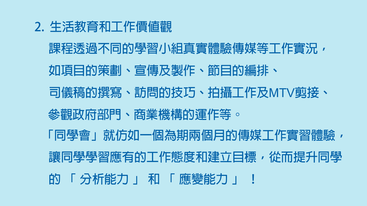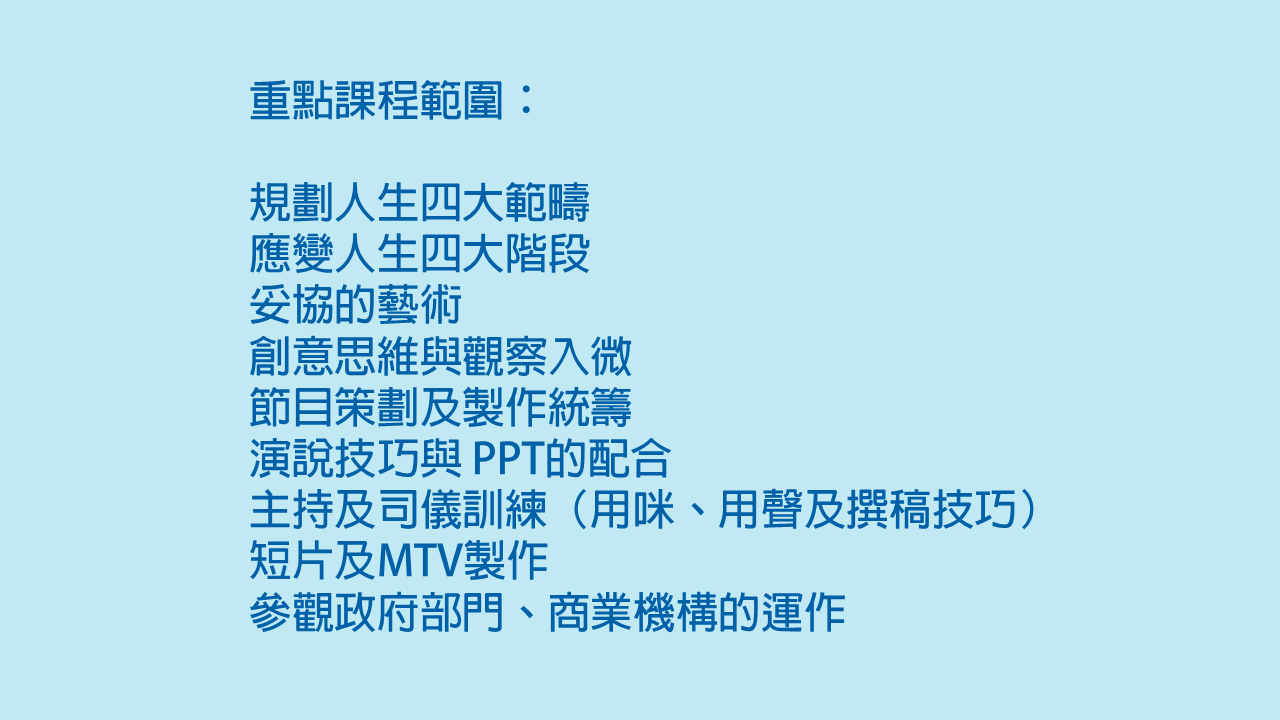 麥Sir為同學精心設計為期十個星期的活動,目的不是要學得更多,而是要將學到的運用得更多,鼓勵同學勇於主動,實踐所學,建立責任感和提升抗逆能力。過程中透過一系列的趣味訓練和戸外活動,從而建立友誼,擴闊社交圈子; 透過夏令營、活動策劃和統籌的過程,從而感受團隊精神,學習與人相處;透過専題課程,增強觀察力及分析力,從而懂得應變,體驗生活的充實;透過生命教育, 練習面對困境,從而培養永不放棄的精神,建立人生意義。