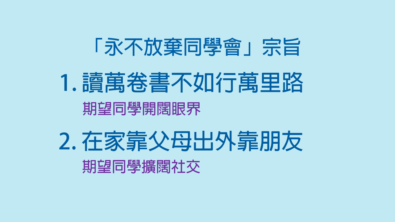 「永不放棄同學會」讓同學有機會參觀不同的機構,包括航空公司、政府飛行服務隊、浸會大學電影學院等,瞭解和感受背後的運作,從中啟發不同角度的思維,開拓不同領域的興趣。我們近年更拓展學習空間,到清遠、四川、寧夏和海南等地,感受不同的生活和文化,體驗人生的無常,珍惜生命的價値。