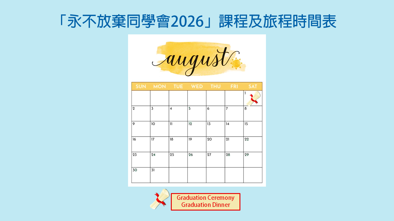 「永不放棄同學會」成立於2002年,每年都為應屆公開試考生提供別具意義的暑期學習課程,讓同學培養正面的價值觀,亦為未來踏出社會作好装備,渡過一個畢生難忘的充實暑假,參與人數至今已逾3000人。