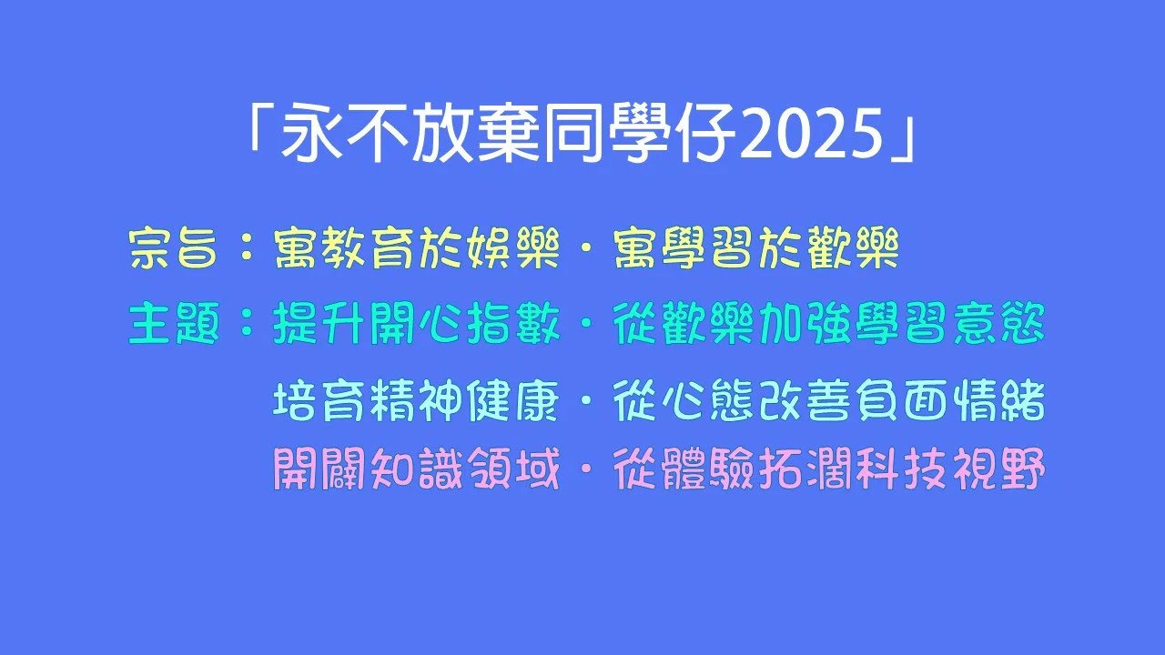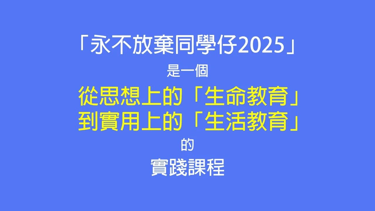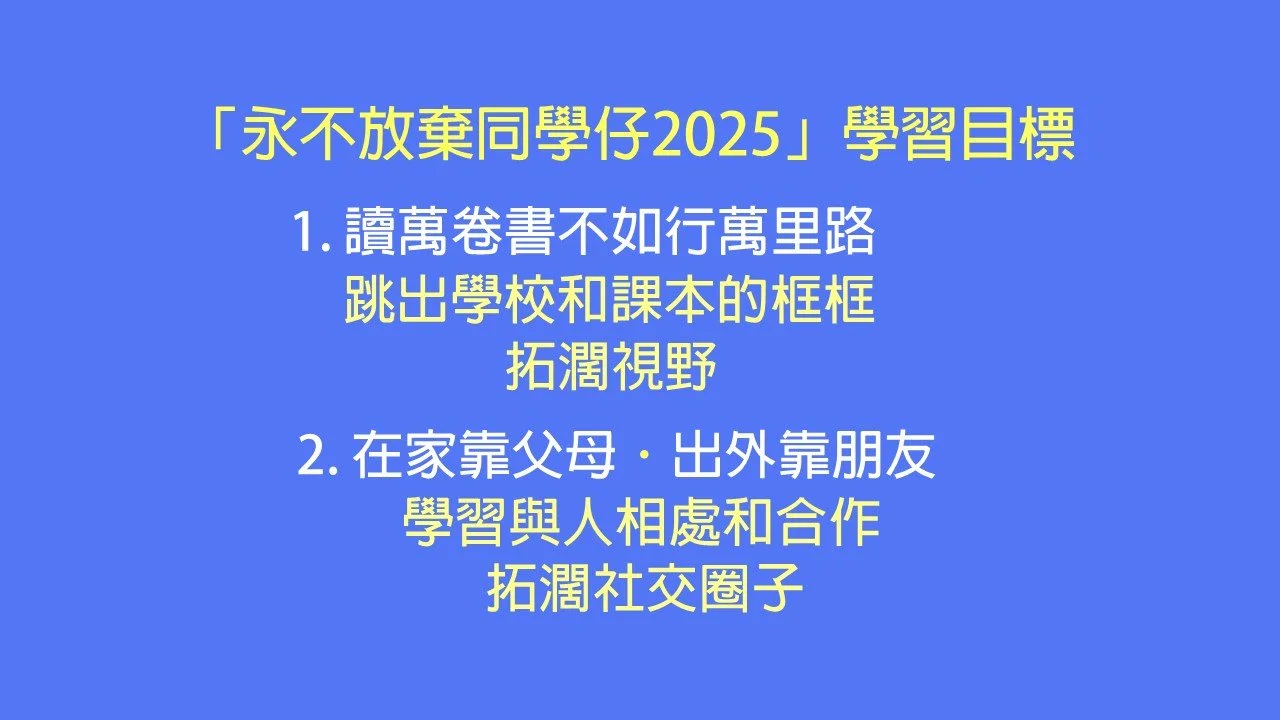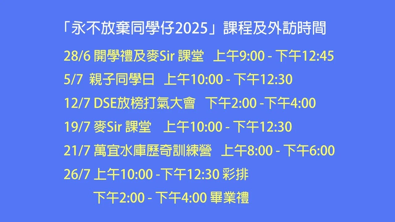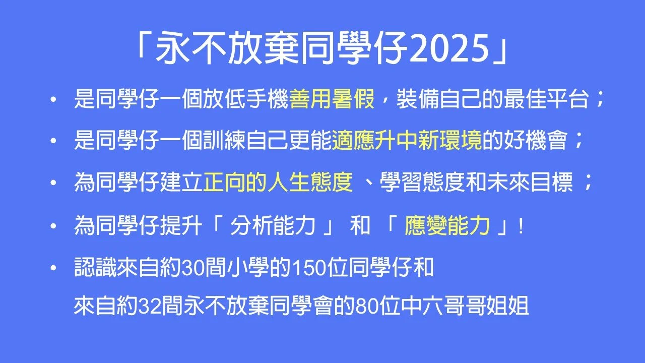 「永不放棄同學仔2025」現已開始接受報名,有興趣就快D在專頁內報名啦!活動內容也可參看專頁內的短片和花絮!至於確實細節會於面試後的家長簡介會公佈!
