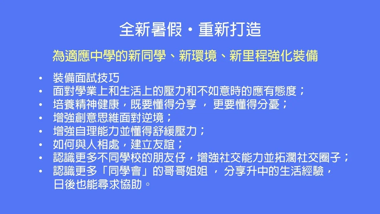 我們提供一個重建學習態度和與人溝通的課程,讓小五、小六的同學仔在升中前愉快增值, 學習適應新環境、新事物和面對新同學,也可認識同學會的哥哥姐姐,拓濶社交和視野,既可過一個充實的暑假,亦可作好準備,迎接中學的新挑戰!